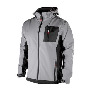 Куртка SOFTSHELL, светло серо-черная, с капюшоном, трехслойная, ткань стрейч 300GSM 100D с водо-, ветрозащитой, XXL INTERTOOL SP-3125
