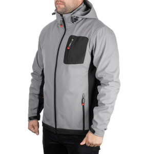 Куртка SOFTSHELL светло серо-черная, с капюшоном, трехслойная, ткань стрейч 300 GSM 100D с водо-, ветрозащитой, размер М INTERTOOL SP-3122