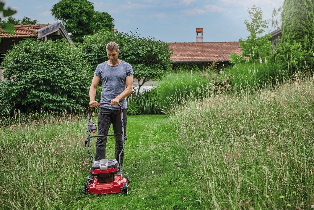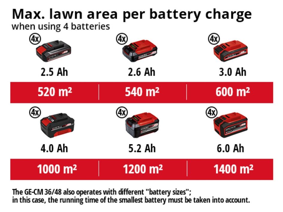 Акумуляторна газонокосарка Einhell GE-CM 36/48 Li M-Solo є членом сімейства Power X-Change, працює від безщіткового електродвигуна і забезпечує продовжений час роботи завдяки технології "Double Twin Pack Technology". Модель Highwheeler має дружні до газону колеса великої площі та міцний корпус зі сталевого листа. Висота скошування мульчувальної газонокосарки регулюється в 6 положеннях осьово (30-75 мм), також опціонально можна приєднати комплект для бокового викиду.