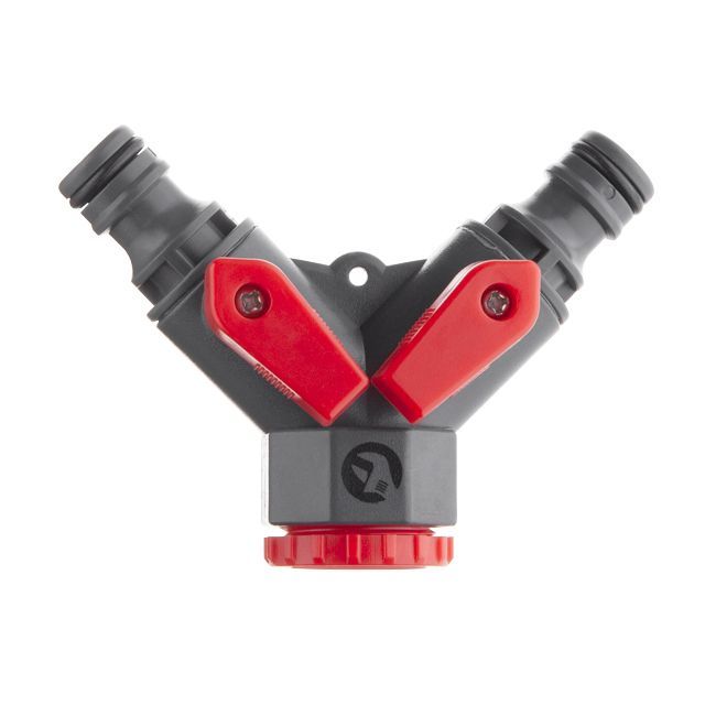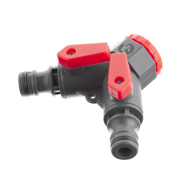 Распределитель позволяет разветвлять источник воды на два независимых потока. Понадобится в саду, для орошения клумб, газонов, огородов и пр. Оснащен запорными клапанами на каждом канале и позволяет регулировать или перекрывать потоки независимо друг от друга.