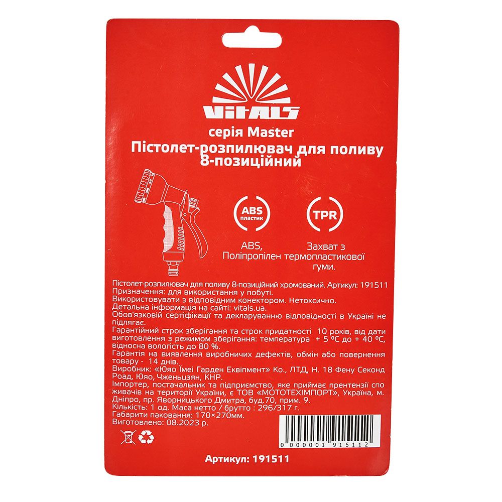 Пістолет-розпилювач восьмипозиційний хромований металевий Vitals Master призначений для поливу рослин при підключенні до водопровідного шлангу за допомогою конектора ½".