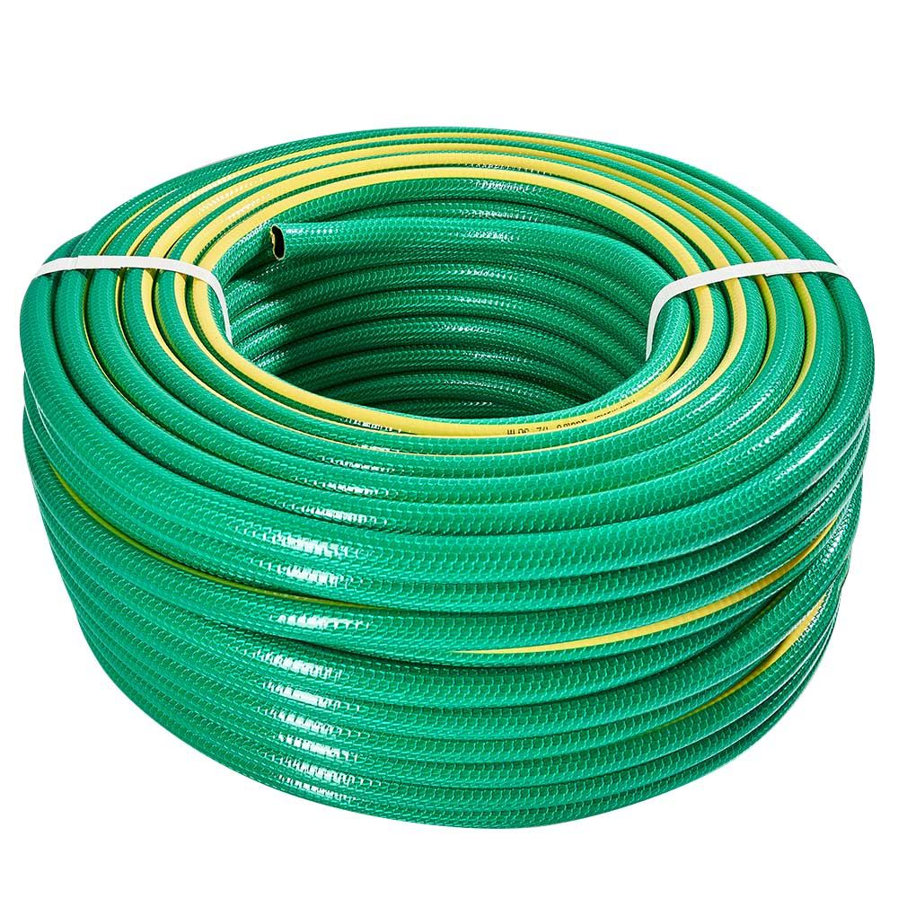 Шланг садовий для поливу Vitals Master "Quattro" - це високоякісний та зручний шланг для поливу саду, городу, газону чи клумб. Шланг має діаметр ½" і довжину 50 м, що дозволяє охопити велику площу поливу. Шланг виготовлений з полівінілхлориду (ПВХ), який має високу міцність, еластичність і стійкість до впливу води, ультрафіолетового випромінювання та наростання водоростей. Шланг має чотири шари. Прозорий зовнішній шар виконує роль захисту шлангу від механічних пошкоджень та стирання. Сітчасте обплетення з міцної синтетичної нитки, що становить проміжний шар, робить шланг стійким до розтягування та розривів. Третій шар додатково збільшує загальну товщину шланга та його здатність зберігати форму під час експлуатації та зберігання. Внутрішній шар із гладкою стінкою не створює перешкод потоку рідини усередині шланга. Шланг має робочий тиск 20 бар та тиск на розрив 25 бар, що гарантує безпеку та довговічність роботи. Шланг має робочу температуру від – 5 °С до + 45 °С, що дозволяє використовувати його в різних кліматичних умовах.