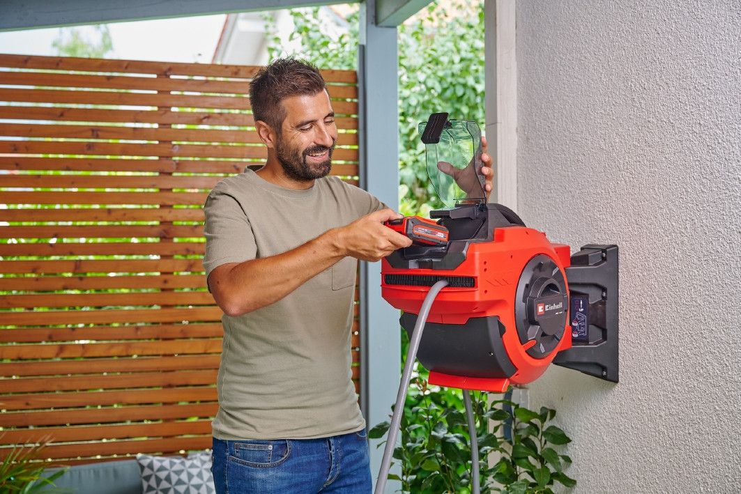 Акумуляторна котушка для шланга Einhell GE-HR 18/30 WH Li-Solo працює від потужного акумулятора 18В Power X-Change та автоматично згортає будь-який садовий шланг довжиною до 30 м з діаметром до 12,5 мм (1/2"). Направляючий механізм шланга та очищувальні щітки забезпечують чистоту шланга під час згортання, а стопорний кульок автоматично зупиняє двигун для запобігання пошкодженням. Котушка є UV-стійкою та водонепроникною, може використовуватися як портативний пристрій або встановлюватися на стіну. Інструмент поставляється без акумуляторних батарей та зарядного пристрою.