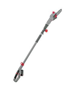 Особливості:Акумулятор та зарядний пристрій не входять в комплект поставки, час зарядки акумулятора 50 хв, шина 20 см, товщина різу до 10 см, телескопічна штанга, 5-ступінчастий регулятор нахилу шини, можливість зрізати гілки на висоті до 3,5 м, вага 3,4 кг (з акумулятором).