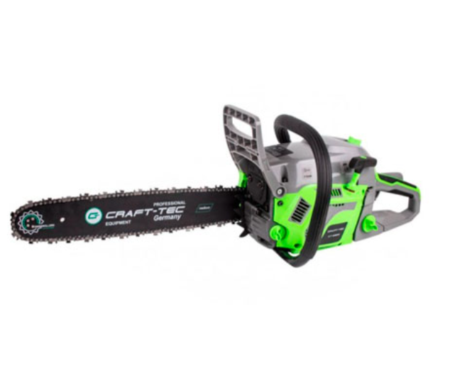Ланцюгова бензопила Craft-tec CT-6900 відноситься до серії «Proffesional» знаменитого німецького виробника, тобто даний інструмент орієнтований не тільки на побутове використання для обрізання гілок та сучків дерев та чагарників у саду, підготовки їх для садового подрібнювача, заготовки дрова для каміна або багаття, виконання столярних робіт, а також на експлуатацію у виробничій сфері для спилювання гілок при валці лісу та розпилюванні дощок при невеликій інтенсивності в столярному виробництві. “Легкий старт” дозволяє швидко запускати двигун у будь-яких умовах. Конструктори бензопили Крафт-Тек 6900 не залишили без уваги також питання безпеки оператора при роботі з Craft-tec 6900. Встановлене на агрегат автоматичне інерційне гальмо ланцюга, при заклинюванні шини забезпечує зупинку робочого органу за 0,12 секунди. Захист рук оператора від зворотного удару виконує передній екран, встановлений позаду шини. Балансування агрегату та виконання рукояток із спеціального покриття складають комплекс заходів щодо запобігання впливу вібрації на організм працюючого. Комплектнiсть: Бензопила Craft-tec CT-6900; Шина ― 2 шт; Ланцюг – 2 шт; Інструкція користувача; Набір ключів у зручній сумці; Ємність для змішування палива та олії; Лійка.