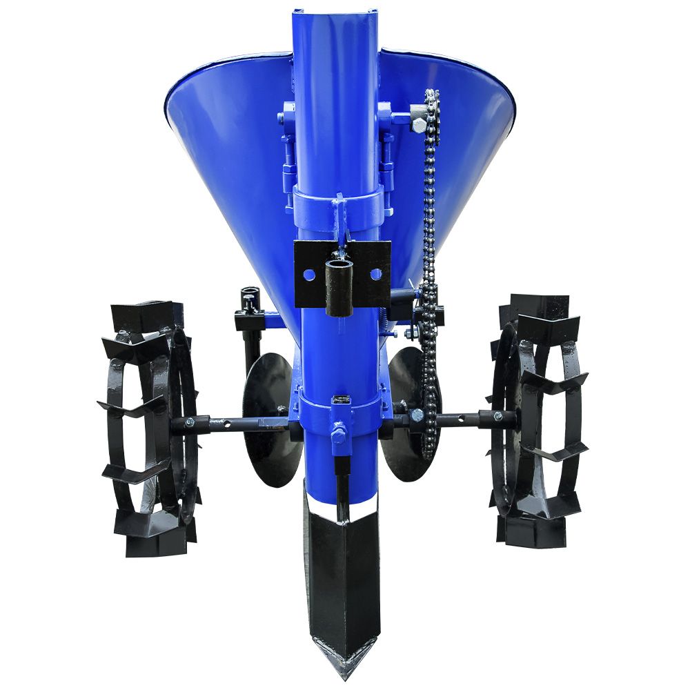 Картоплесаджалка мотоблочна К-1Ц має просту конструкцію і суттєво полегшує процес посадки картоплі в один ряд. Привід механізма посадки картоплі здійснюється через ланцюг від ґрунтозацепів. Ложечки для укладання картоплі розташовані на ланцюзі. Бункер конусної форми ємністю 20 л.