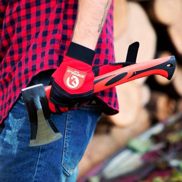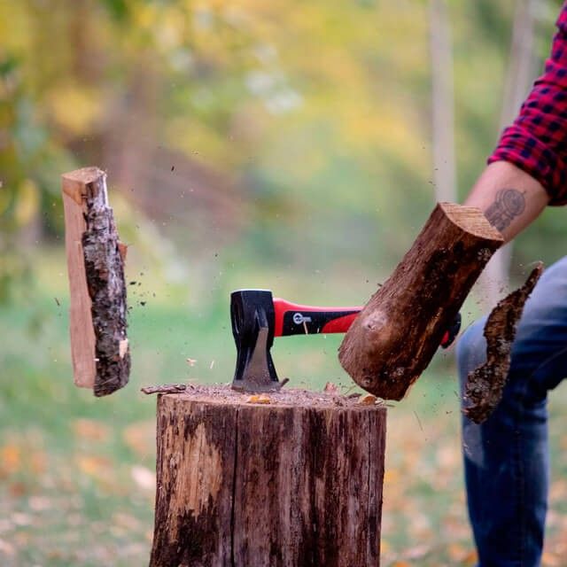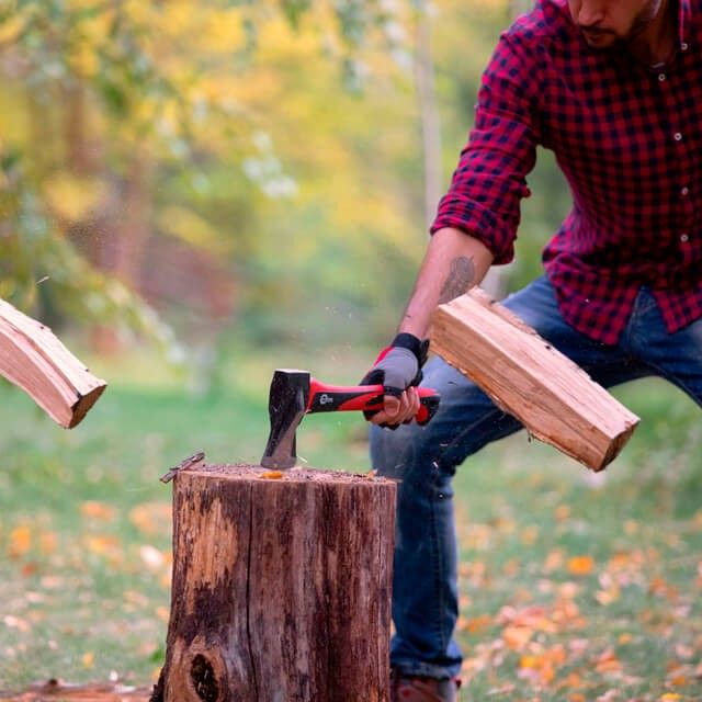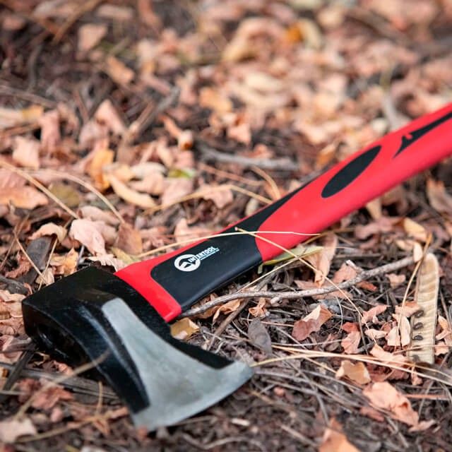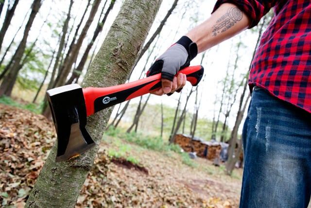 На топорище размещен клин для более эффективного раскола твердых пород и больших в диаметре бревен.