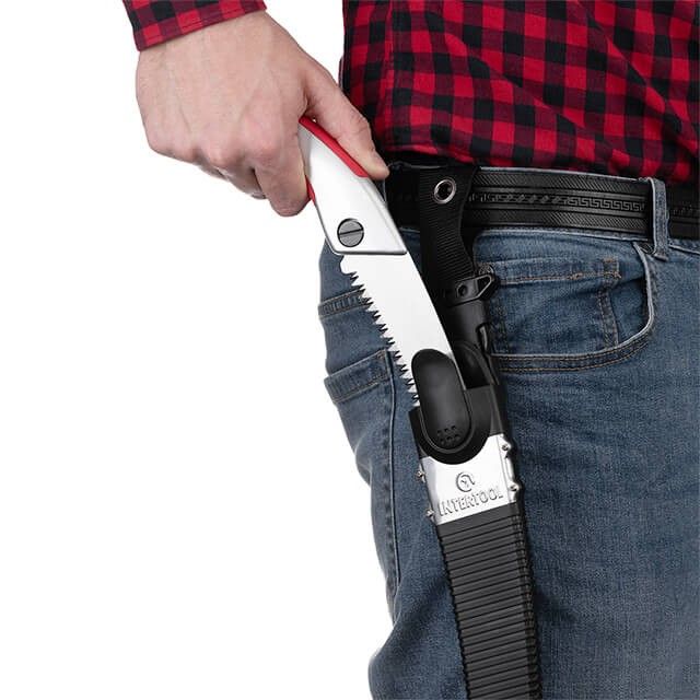 Ножовка всегда с собой и не мешает, когда руки должны быть свободны, благодаря чехлу и удобному поворотному креплению к поясу.