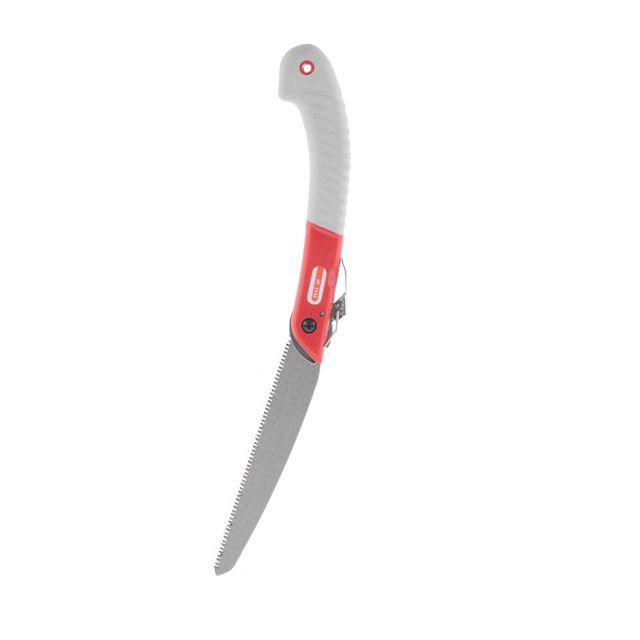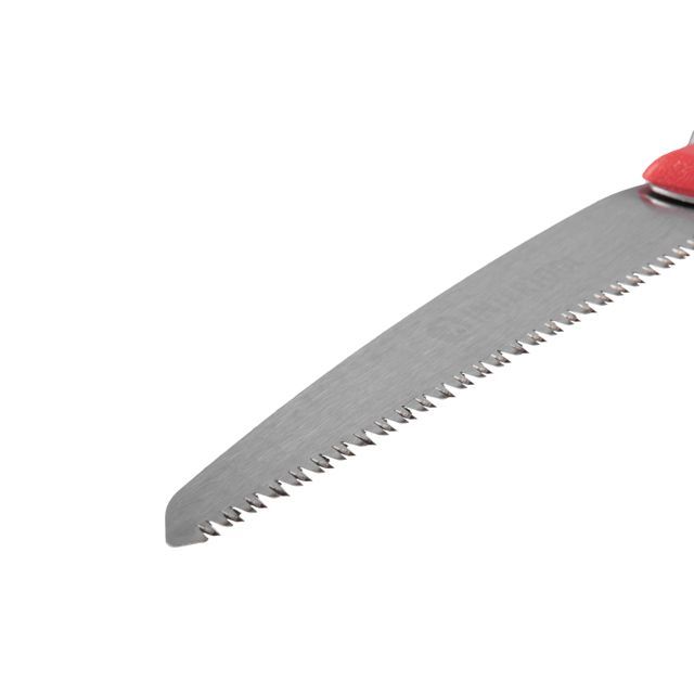 Пила садовая не деформируется, а заточка долго остается острой, производится из износостойкой инструментальной стали. Ручка легкая, изготовлена из пластика, удобная с противоскользящим рифлением. Благодаря складной конструкции с фиксатором, пилу можно компактно сложить и безопасно носить с собой в рюкзаке, в сумке с другими инструментами и пр.
