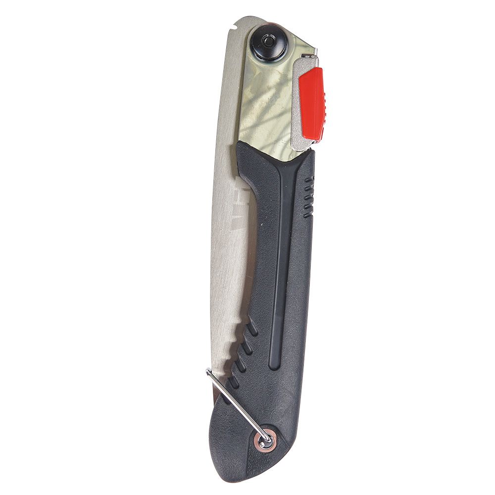 Є надійний фіксатор для безпечного зберігання пили в складеному вигляді.