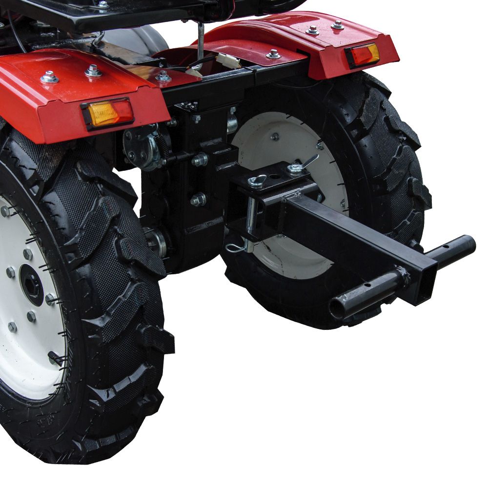 Трактор обладнаний мотоблочною буксирувальною зчіпкою, що дозволяє приєднувати навісне обладнання. Металеві передні та задні крила підвищують захист механізмів і забезпечують довговічність конструкції.