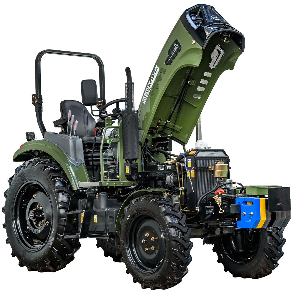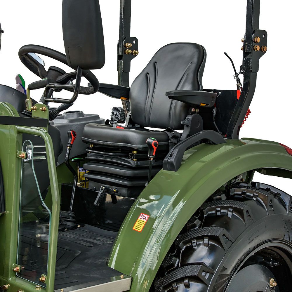 Механічна шестеренчаста трансмісія з комбінацією передач (4×2)+(4×2) та окремою реверсивною коробкою забезпечує маневровість та універсальність. Дводискове зчеплення забезпечує плавне передавання потужності. Повний привод 4×4, гідрооб’ємне кермування з окремим насосом, роздільні педалі гальм із можливістю синхронізації — усе це забезпечує контроль та надійність на будь-якому покритті.