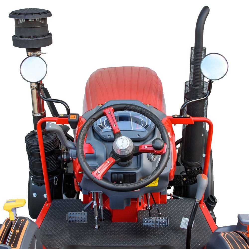 Трактор обладнаний ергономічним сидінням з амортизатором, підлокітниками та регулюванням за відстанню. Панель приладів — багатофункціональна, з цифровими індикаторами. Є рівна підлога, магнітола, електророзетка для причепа та базовий комплект світлотехніки (фари, покажчики поворотів, габарити, сигналізація). Кабіна відсутня, але базова комплектація передбачає все необхідне для роботи у помірних погодних умовах.