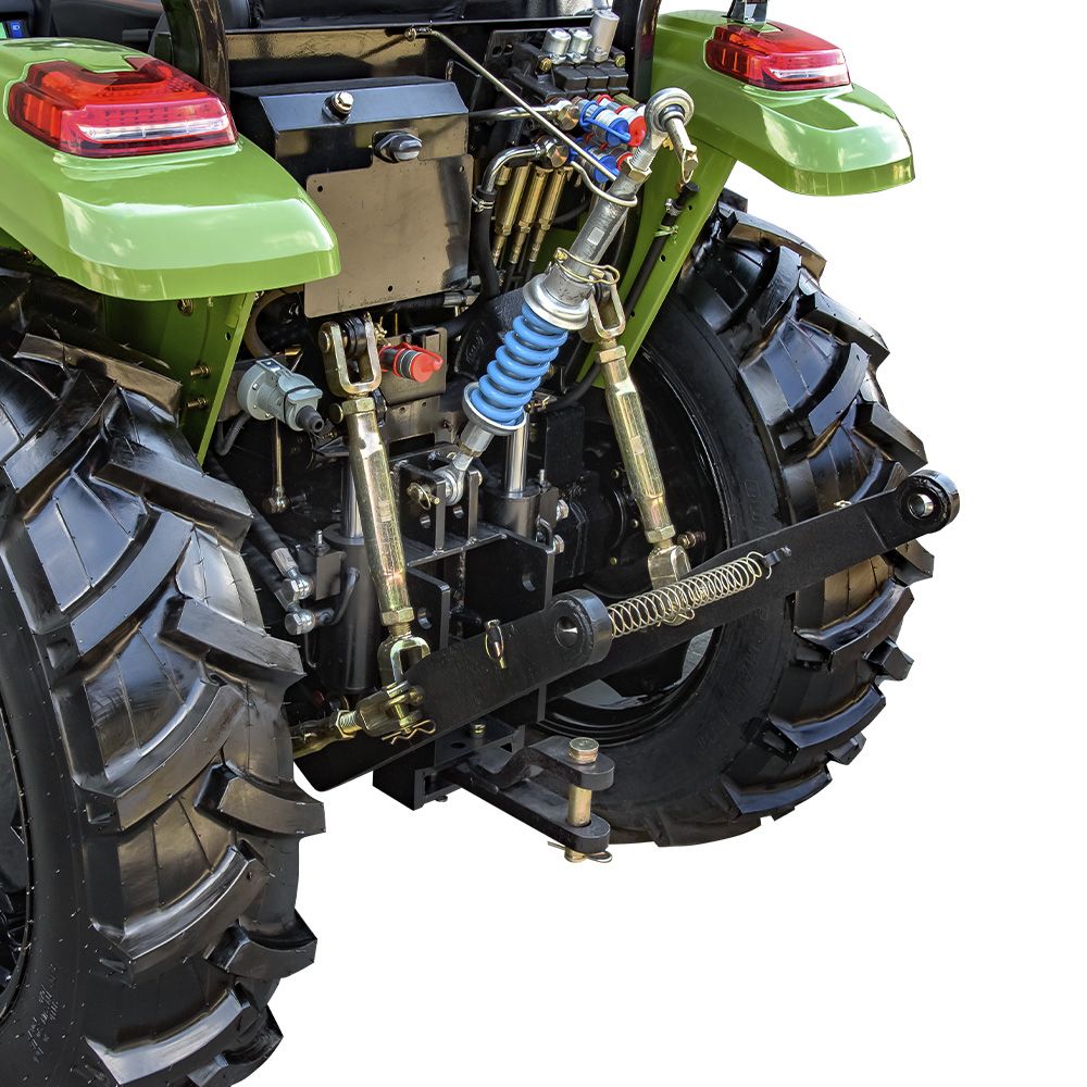 Трактор обладнаний механічною шестеренчастою трансмісією з формулою перемикання (4×2)+(4×2) та окремою реверсивною коробкою. Дводискове зчеплення постійно замкнутого типу передає крутний момент без втрат. Повний привод 4×4 забезпечує впевнене зчеплення з ґрунтом навіть у складних умовах. Гідрооб’ємне керування з окремим насосом робить керування легким та точним. Гальмівна система — барабанна з роздільними педалями та можливістю їх синхронізації.