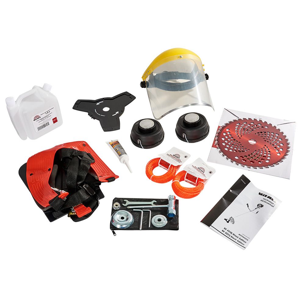 Напівавтоматична шпуля з ліскою діаметром 2,4 мм призначена для косіння трави та невеликих бур’янів. Завдяки системі автоматичного заправлення, заміна ліски не потребує розбирання котушки, достатньо протягнути ліску наскрізь і просто намотати її. Шпуля виготовлена з міцного ударостійкого пластику, що значно подовжує термін її служби. Трилопатевий ніж виготовлений зі зносостійкого матеріалу, що робить його ідеальним для косіння рослин із товстими стеблами, таких як очерет, лопухи тощо. 40-зубий ніж із побідитовими напайками здатний легко впоратися з найскладнішими завданнями без зусиль. Він незамінний під час скошування порослі чагарника та гілок діаметром до 2 см.