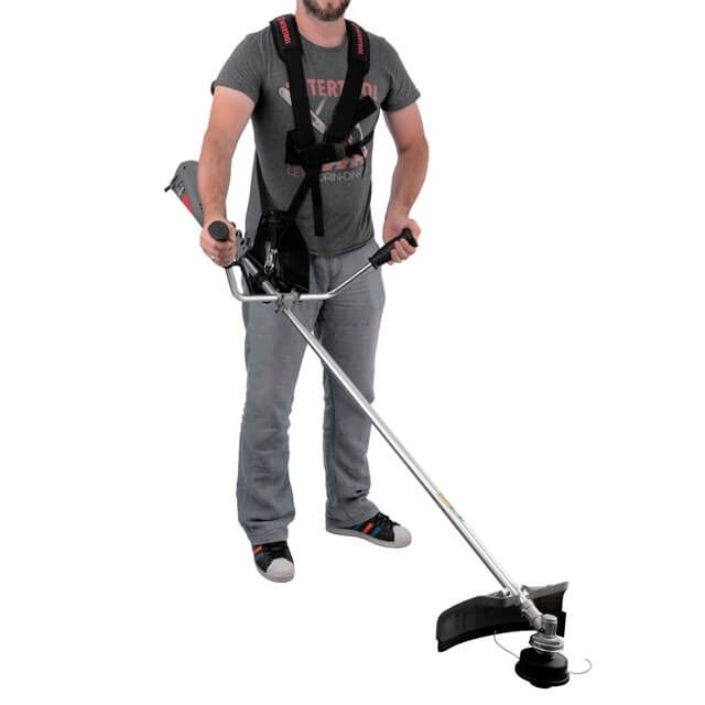 Двухплечевой ранцевый ремень с регулировками отлично распределяет нагрузку на всю спину оператора и обеспечивает удобное размещение триммера в руках.
