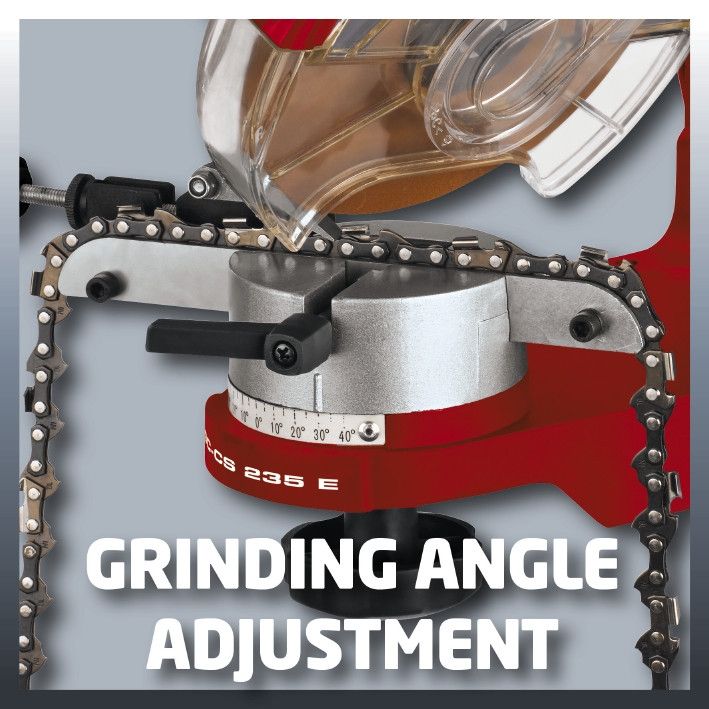 Ограничитель глубины Шкала для точного выбора угла заточки Фиксирующий зажим Шлифовальный диск Подсветка рабочей зоны Поворотная шлифовальная голова Станок для заточки цепей Einhell GC-CS 235 E – это компактный, прочный и надежный помощник в качественной заточке всех стандартных цепей для электропил. Благодаря поворотному зажиму со шкалой для точной установки угла шлифования все режущие звенья цепи можно затачивать без перестановки. Регулятор для установки угла заточки увеличивает область применения станка. Ограничитель глубины защищает цепь от излишнего удаления материала. Вместе с лампой, прозрачное окно обеспечивает точную и безопасную работу даже при плохом освещении.