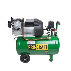 Поршневий компресор Procraft 50л V2 - напівпрофесійний пристрій з потужністю 2800 Вт і робочим тиском 8 Бар, призначений для роботи з пневматичними інструментами. Сфера потенційного застосування компресора широка і охоплює галузі будівництва, ремонту, виробництва. Особливості даної моделі Є два виходи для одночасного підключення двох інструментів, наприклад, шліфувальної машини і дрилі. Обсяг ресивера становить 50 літрів, і необхідний тиск ефективно підтримується завдяки роботі двох поршнів. Встановлено два манометри для контролю над тиском у ресивері й на виході з системи. Завдяки високій потужності двигуна, кількість обертів на хвилину досягає 2900. Переваги компресора Обладнання оснащене автоматикою для регулювання роботи електродвигуна при стисненні повітря. Після досягнення робочих показників система автоматично відключається, але як тільки тиск падає, компресор відновлює роботу. Пристрій добре переносить тривалі навантаження. Захистом від перегріву, крім іншого, служить продумана до дрібниць конструкція компресора - поршні й мотор оснащені спеціальними ребрами охолодження.