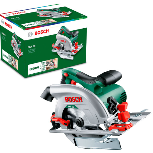 - Дискова пила Bosch PKS 55 — інструмент потужністю 1200 Вт, що працює від стандартної мережі 220 В, стане незамінним помічником у вашій домашній майстерні.